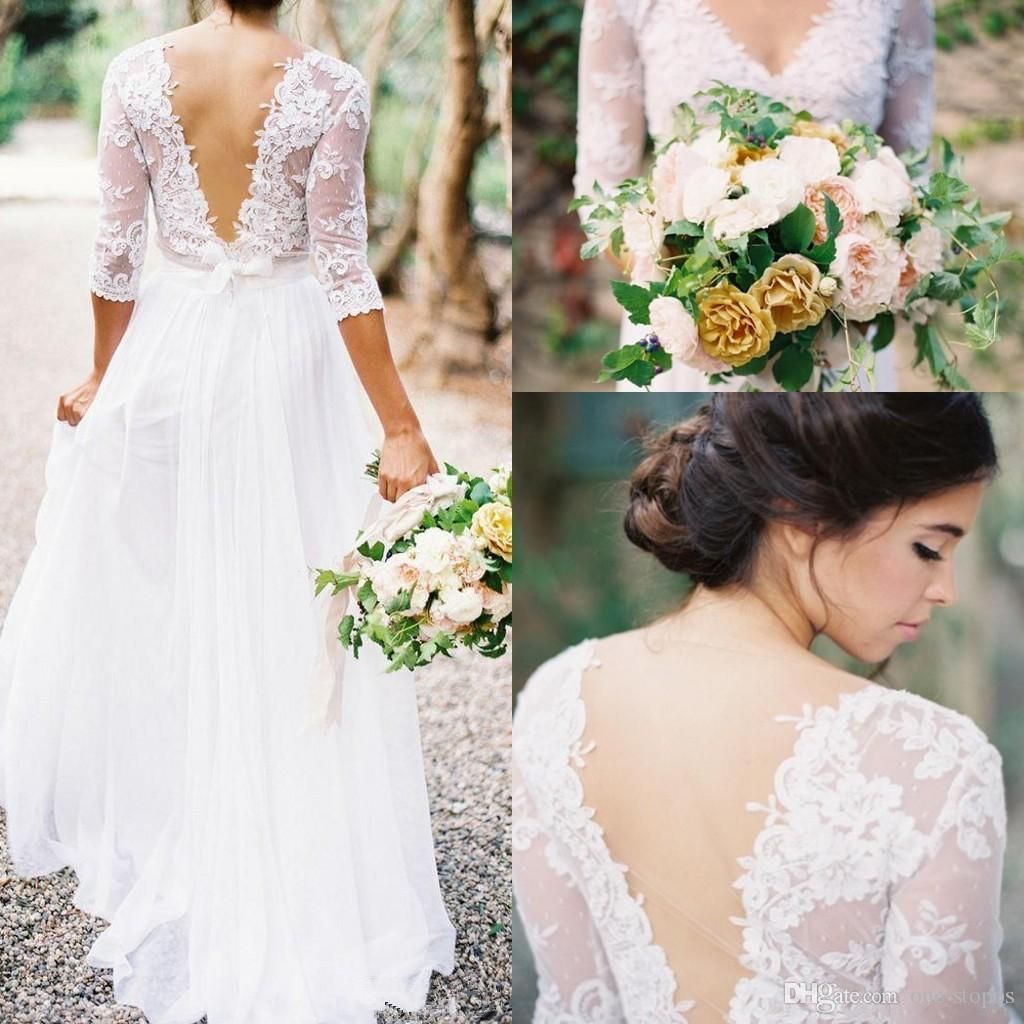 Discount 2019 Bohemian Lace Wedding Dresses 3 4 Long Sleeves V Neck Low Back A Line Chiffon Plus Size Summer Beach Country Garden Bridal Wedding Gow Vintage Gowns Vintage Wedding Gowns From Lovebridals1